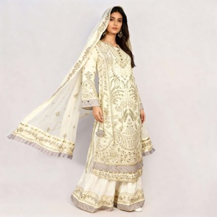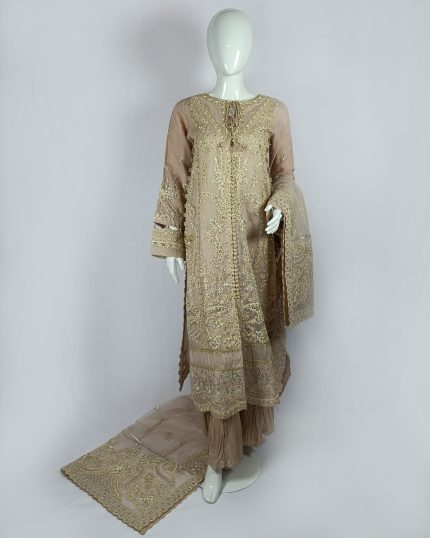 3 PIECES – Hand embroidered shirt with crush gharara & embroidered organza dupatta