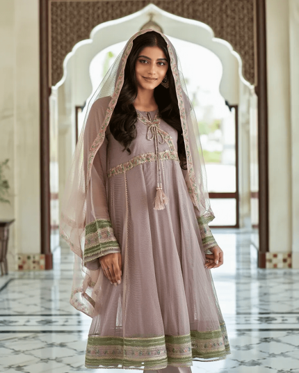 3 PIECES – Embroidered anarkali frok with gharara pant & embroidered dupatta