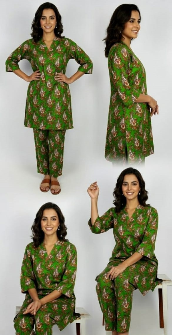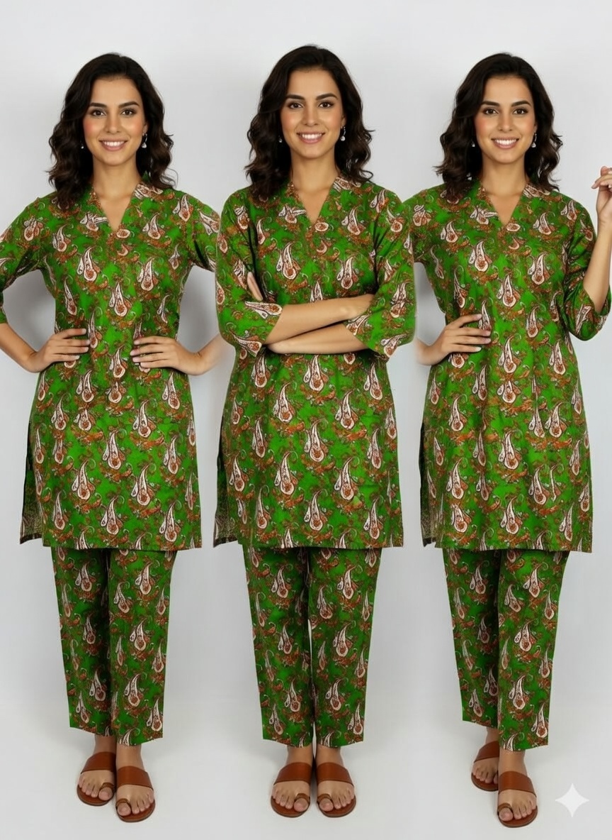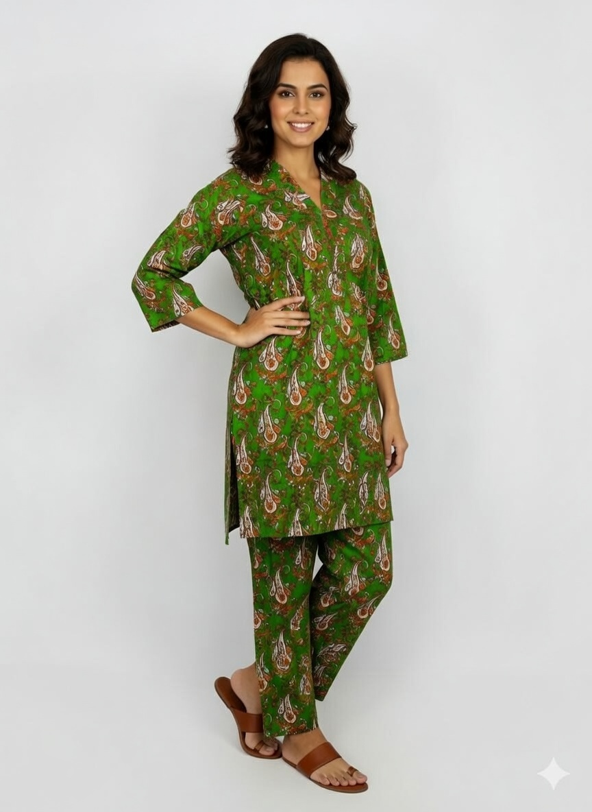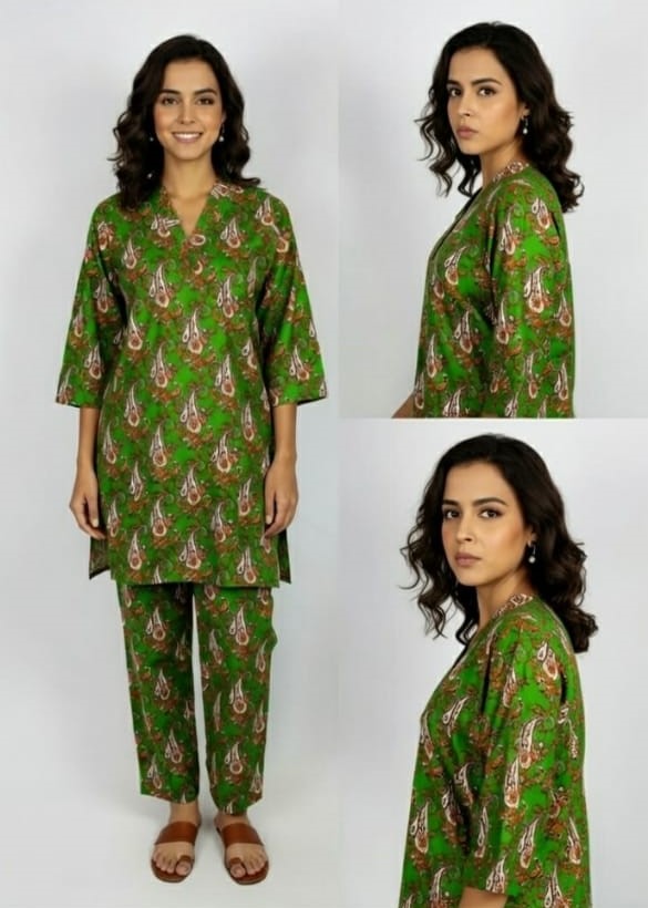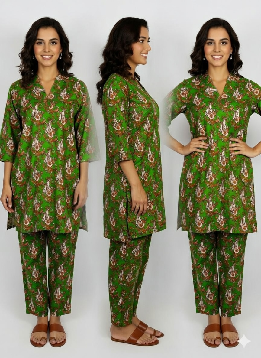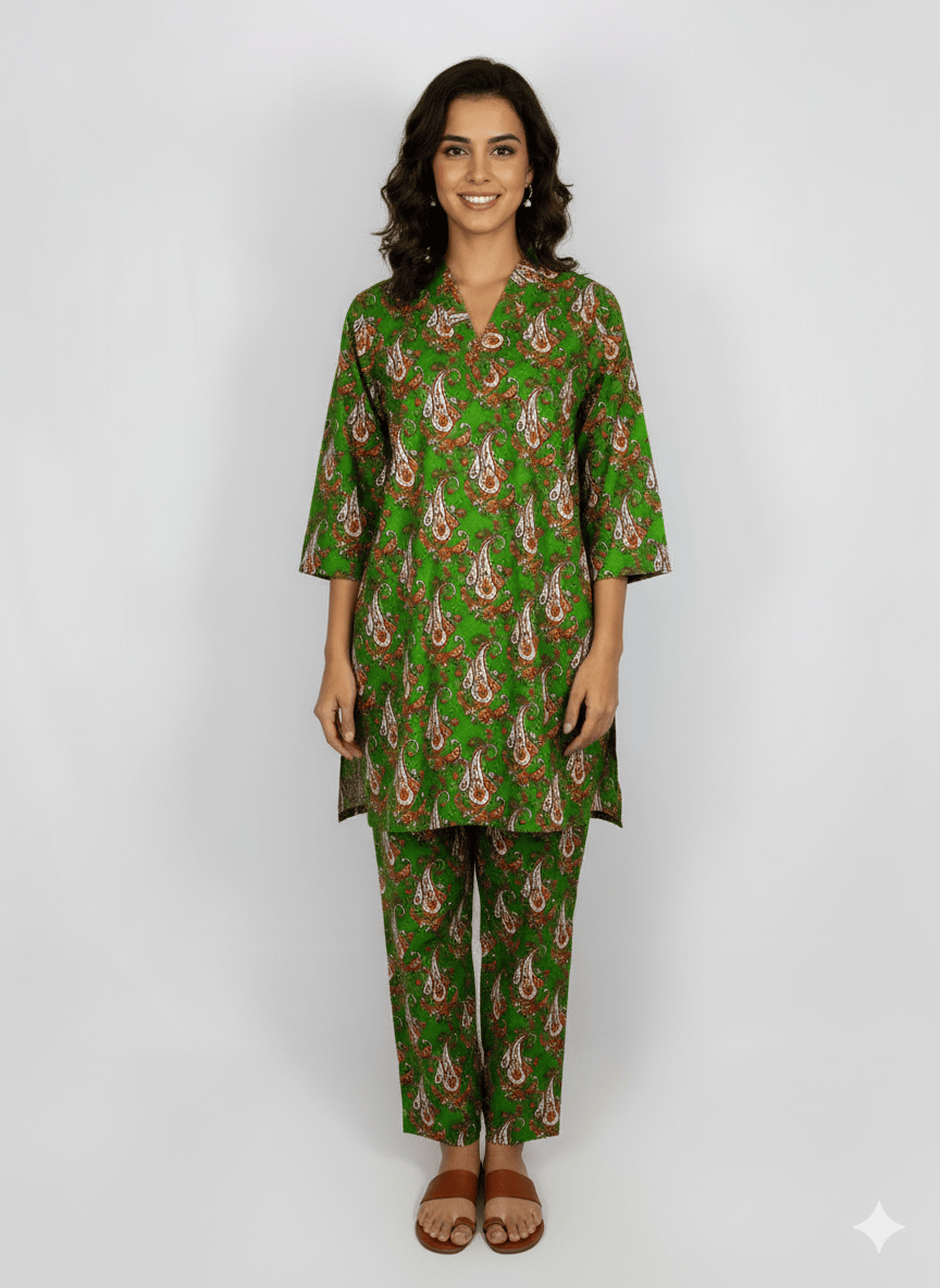 A calm and refreshing green that fits perfectly into your everyday wardrobe. This 2-piece printed co-ord set is stitched from soft Velora fabric, offering comfort throughout the day without compromising on style.