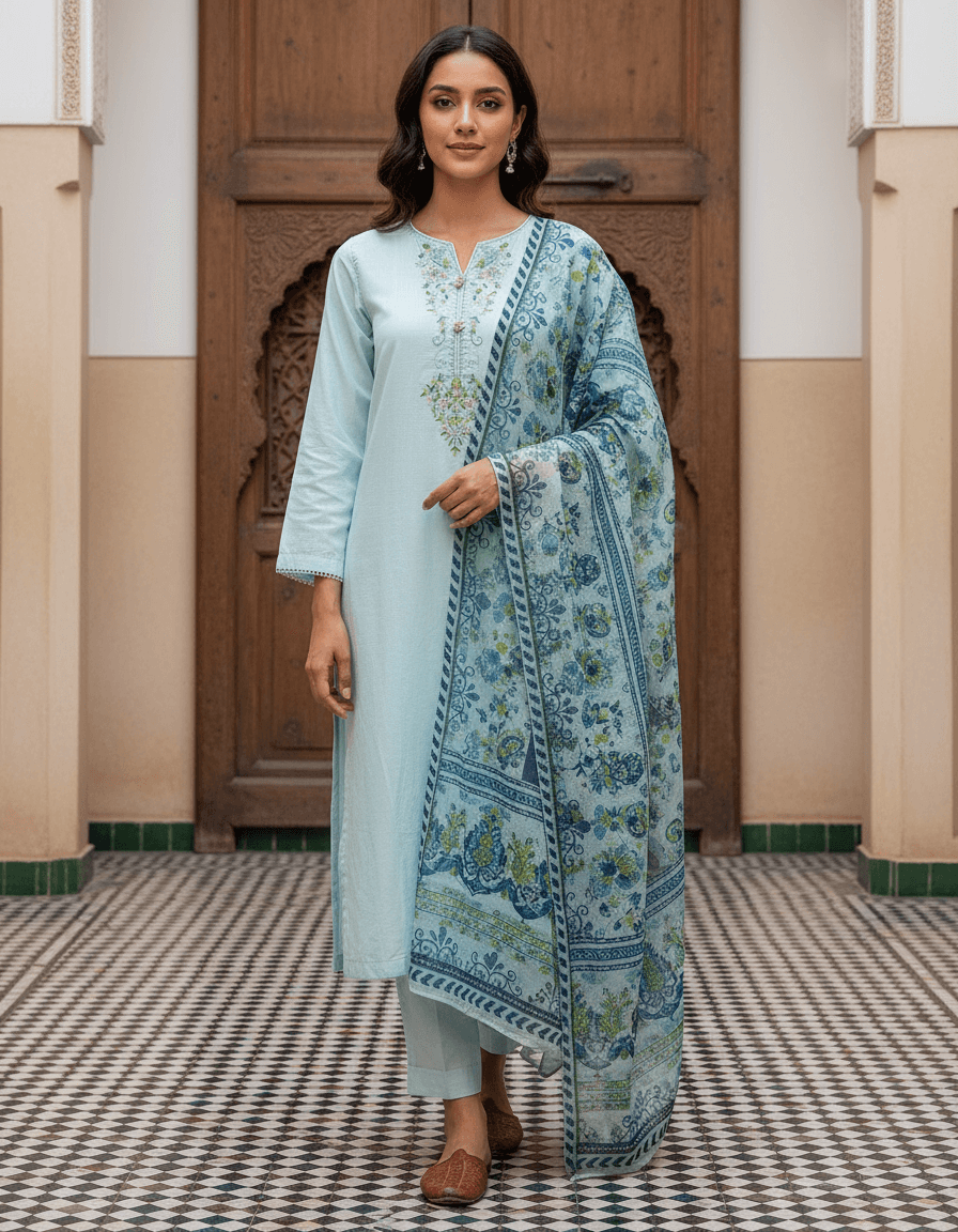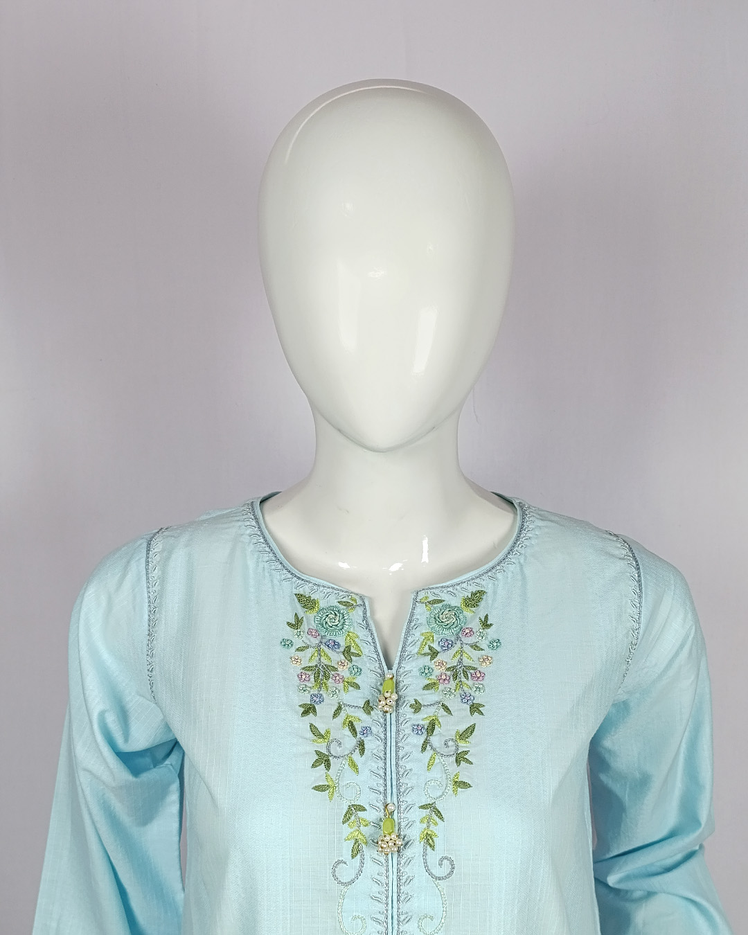 Elevate your style with this elegant 2-piece set featuring a hand-embroidered Malai shirt paired with a beautifully printed chiffon dupatta. Subtle lace, pearl, and bead detailing give it a refined, graceful touch — perfect for casual outings or festive occasions.
