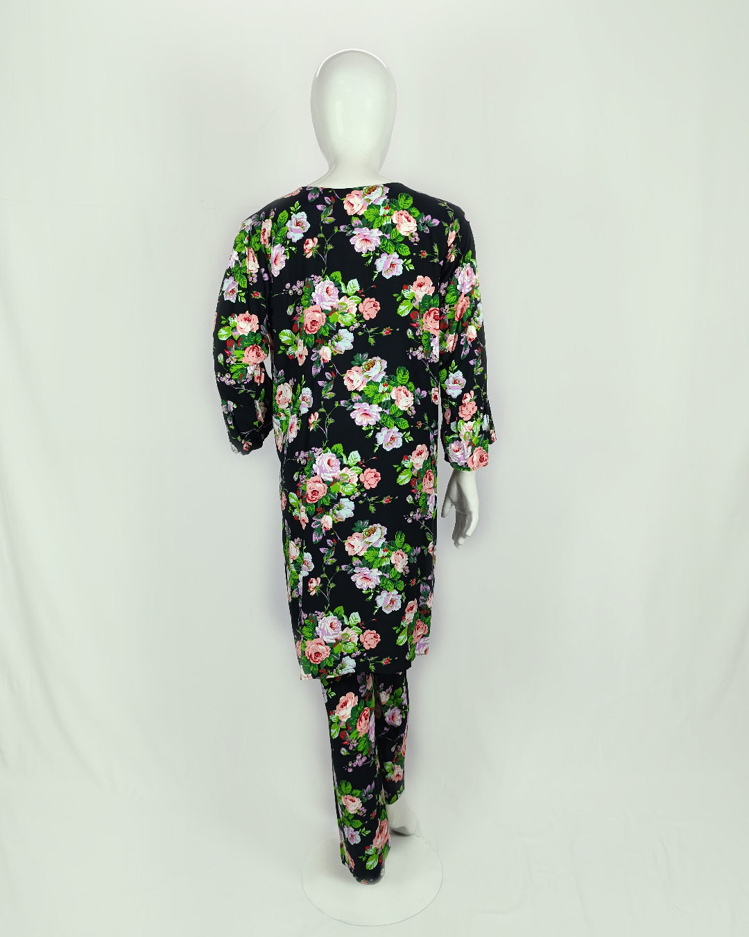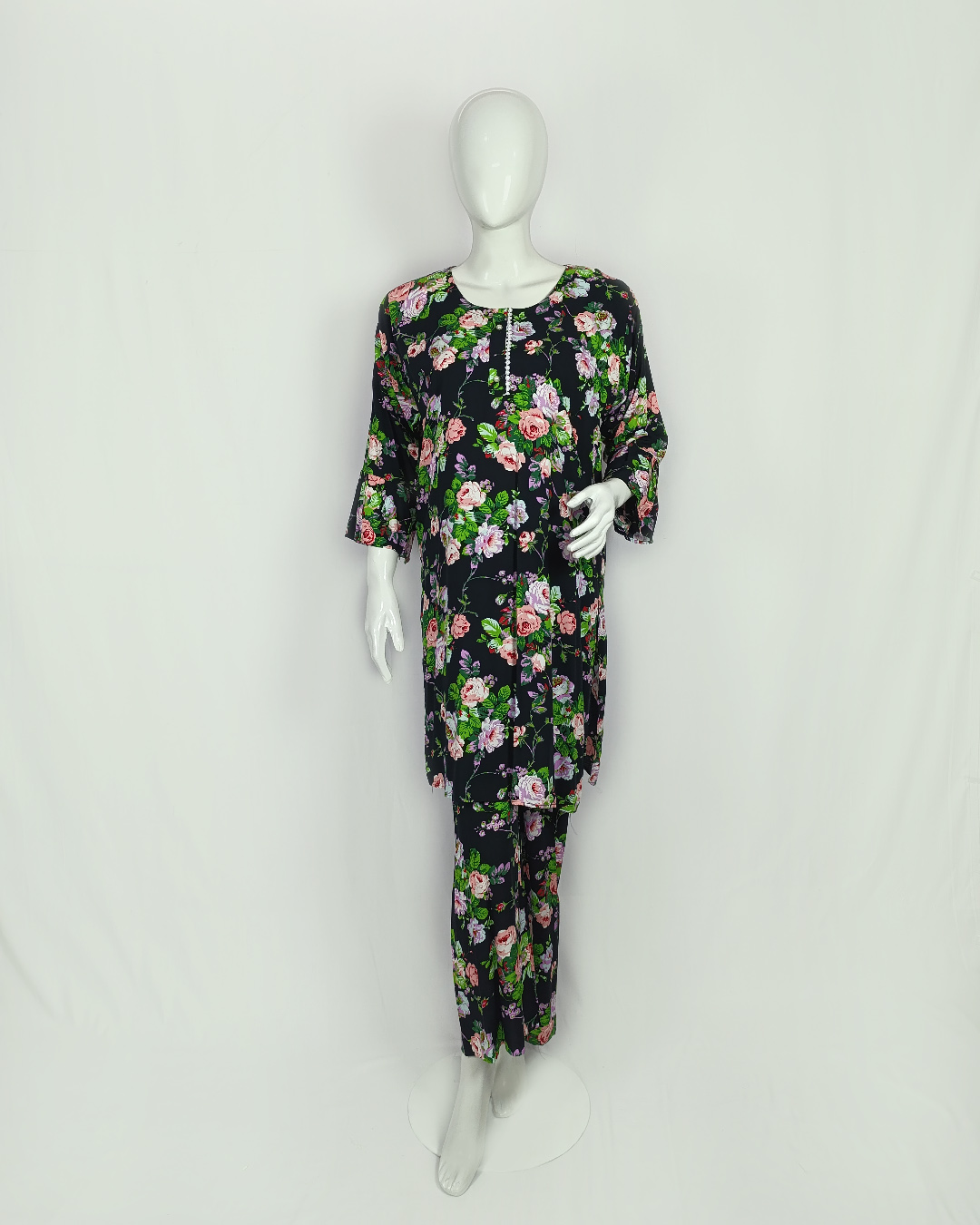 Make a bold yet graceful statement with this 2-piece printed malai linen outfit. The shirt is beautifully highlighted with lace and pearl embellishments, paired with a coordinated printed trouser for a refined everyday look. A timeless black green palette brings sophistication with a touch of warmth — perfect for effortless daily wear.