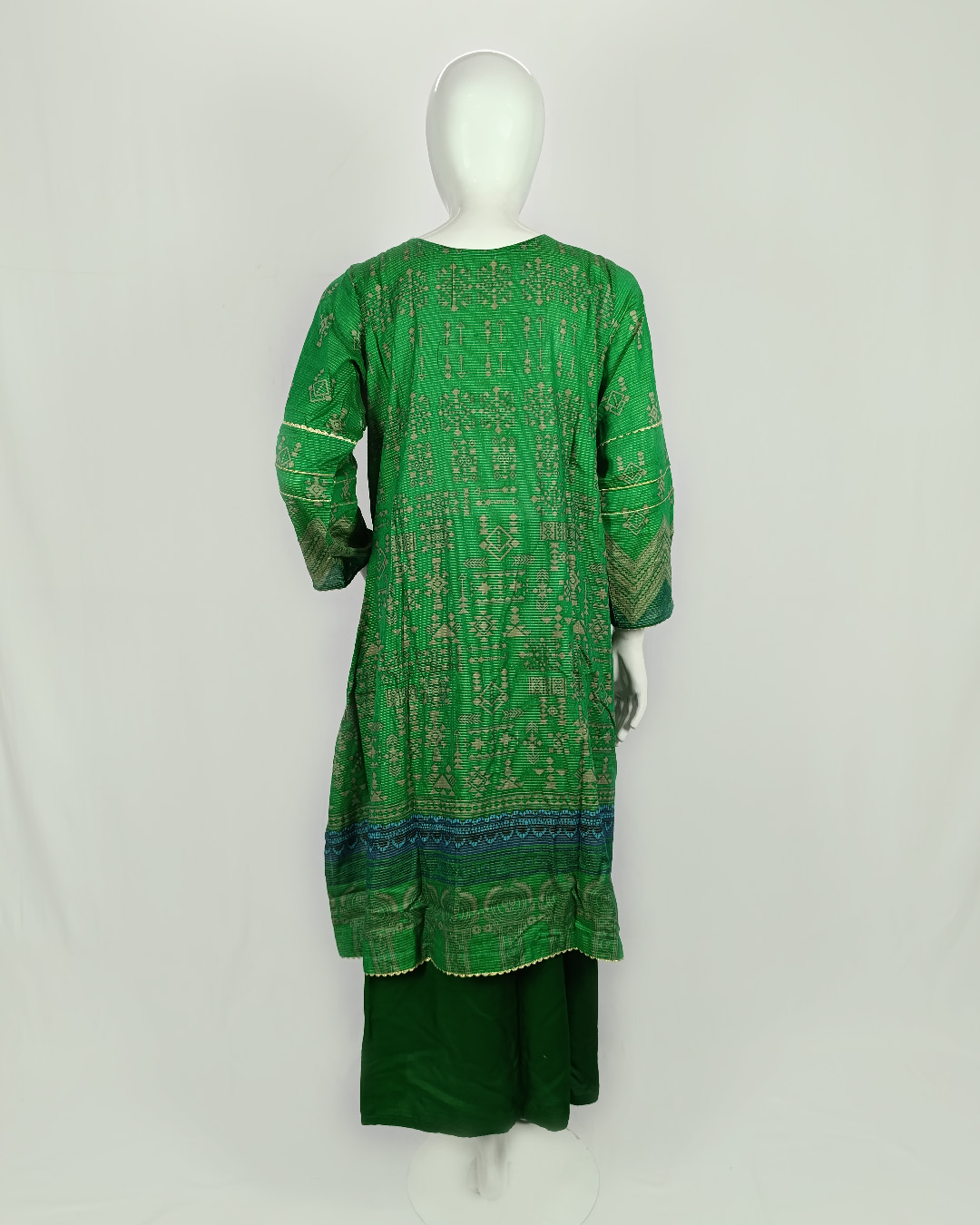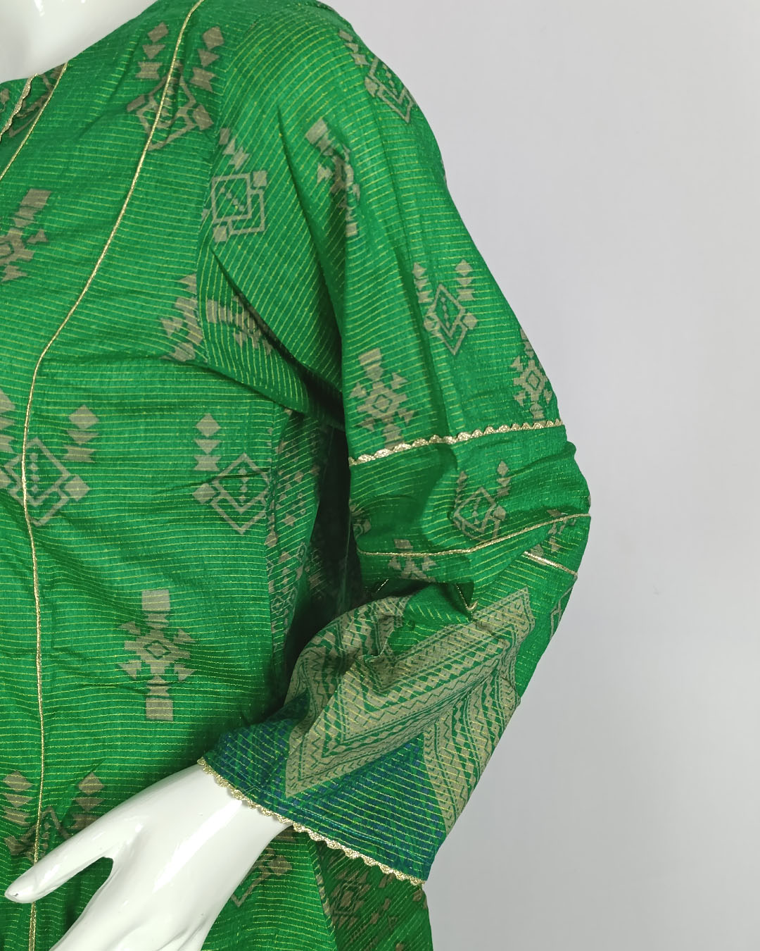 Elevate your everyday look with this 2-piece essential outfit in a refreshing green hue. The printed doria lawn shirt detailed with lace and button accents pairs gracefully with a raw silk trouser, offering a chic balance of comfort and sophistication. A timeless design that speaks effortless elegance.