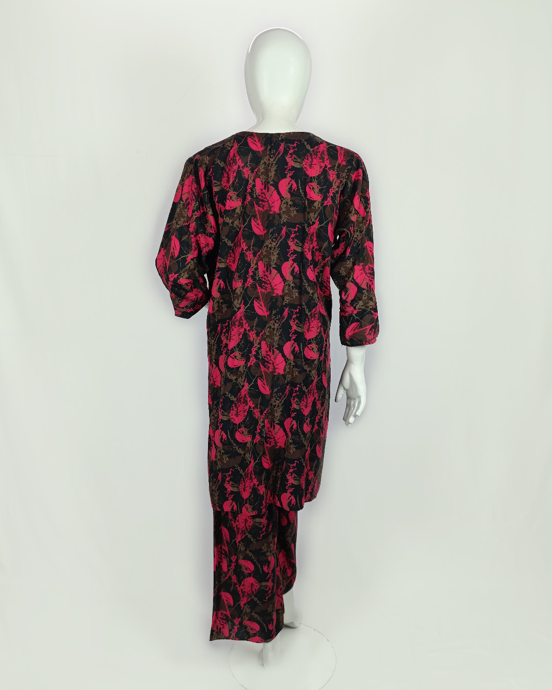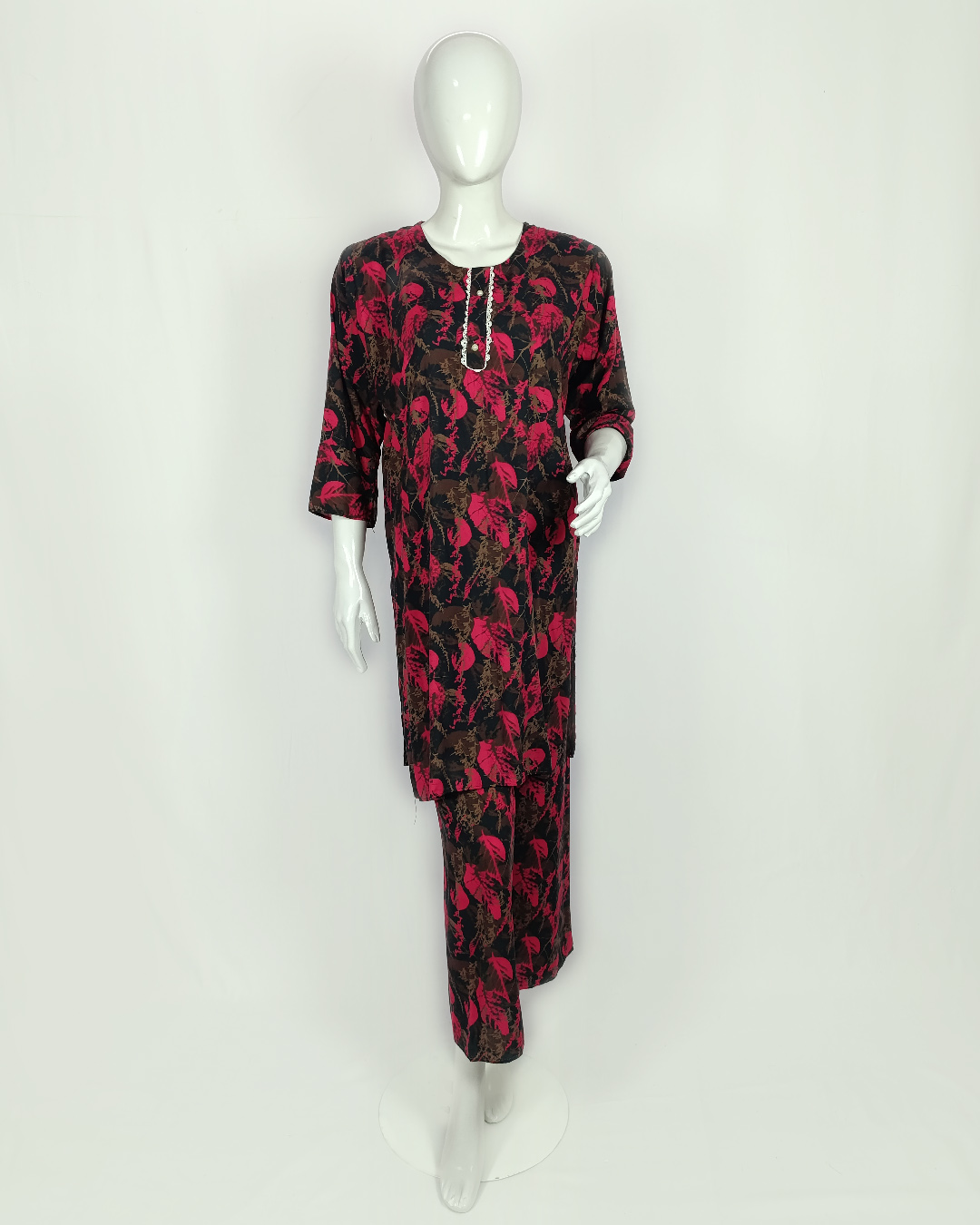Step into effortless comfort and style with this 2-piece essential outfit crafted from printed malai linen. The shirt features a graceful lace finish, paired with a matching printed trouser — a perfect pick for cozy yet chic everyday wear in soft water malon brown tones.