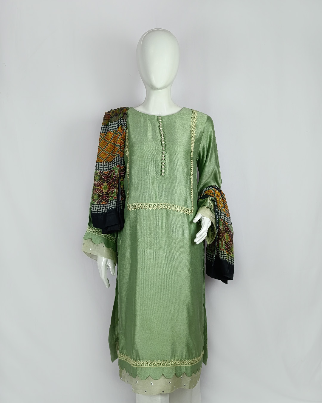 Refresh your wardrobe with this stylish 2-piece set. The machine cotton shirt, adorned with delicate lace and pearl accents, pairs beautifully with a printed chiffon dupatta featuring subtle stone detailing — perfect for casual outings or semi-formal gatherings.