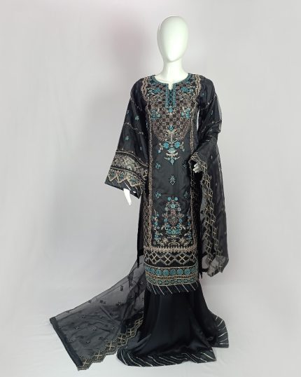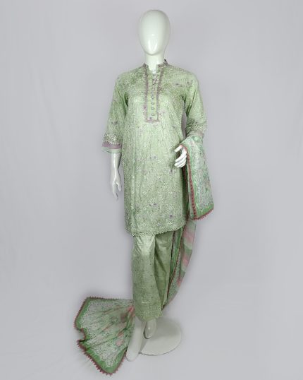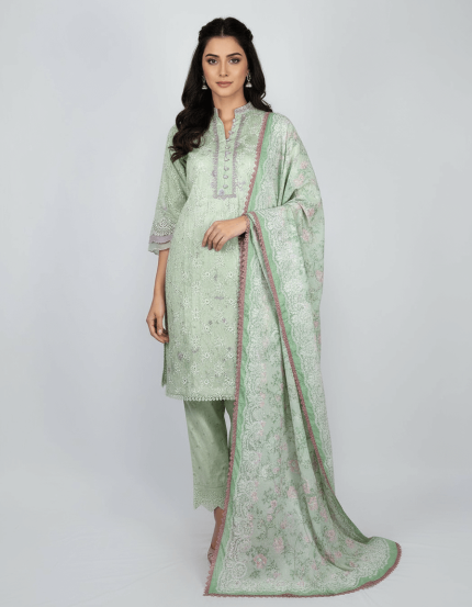 3 PIECES – Embnroidered shirt with trouser & printed munarch dupatta