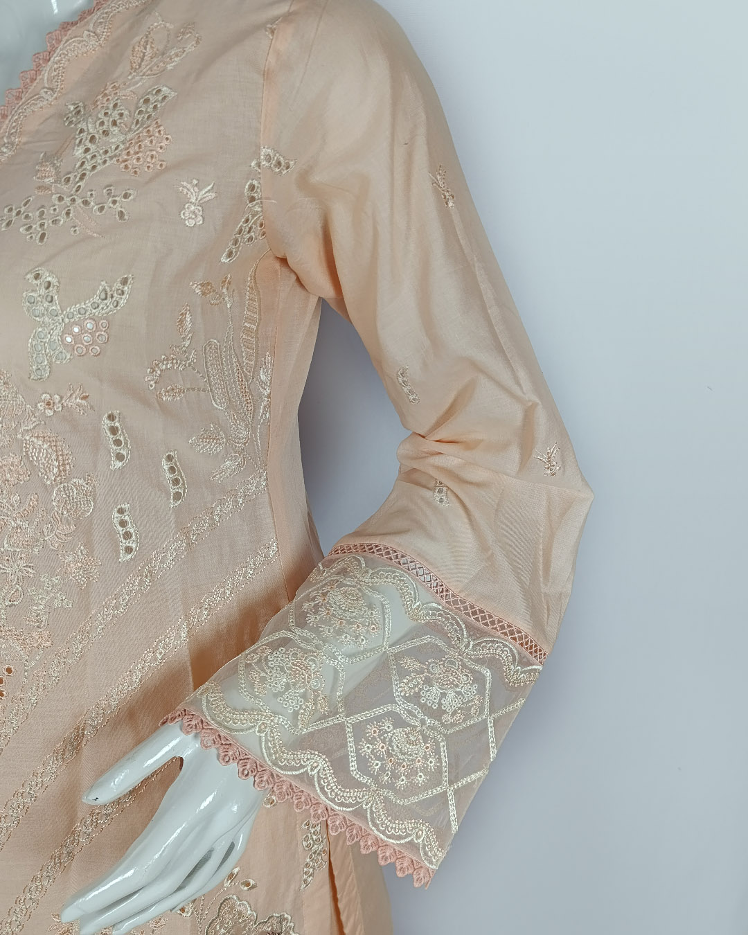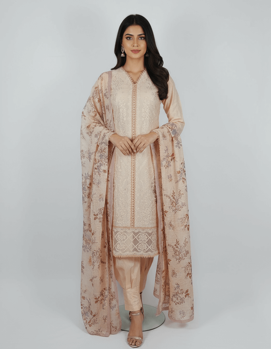 Radiate charm in our 3-piece signature outfit, featuring an embroidered cotton lawn shirt with lace accents, paired with a classic cotton trouser, and complemented by a printed monarch dupatta. A soft peach tone that embodies elegance and sophistication — perfect for refined gatherings.