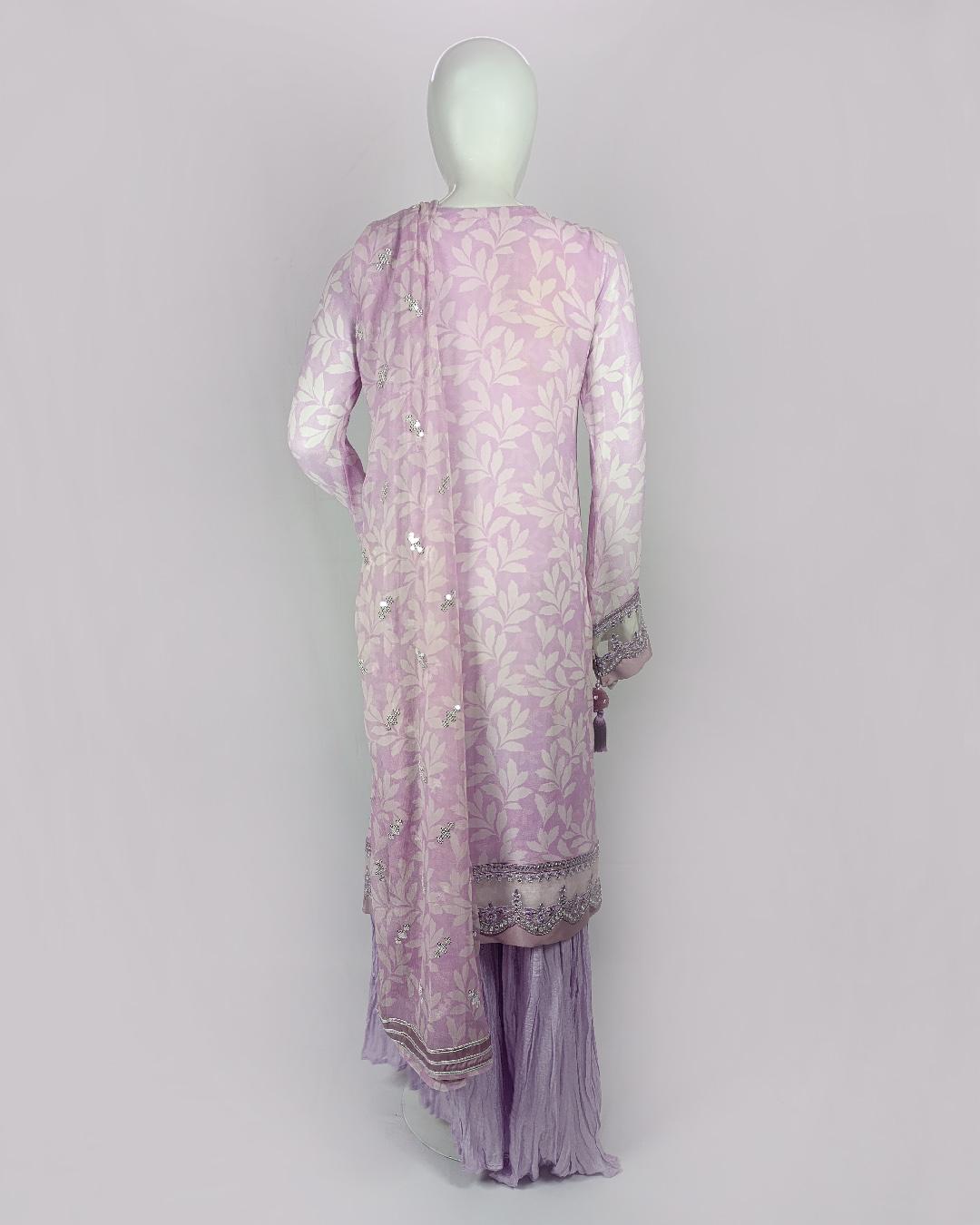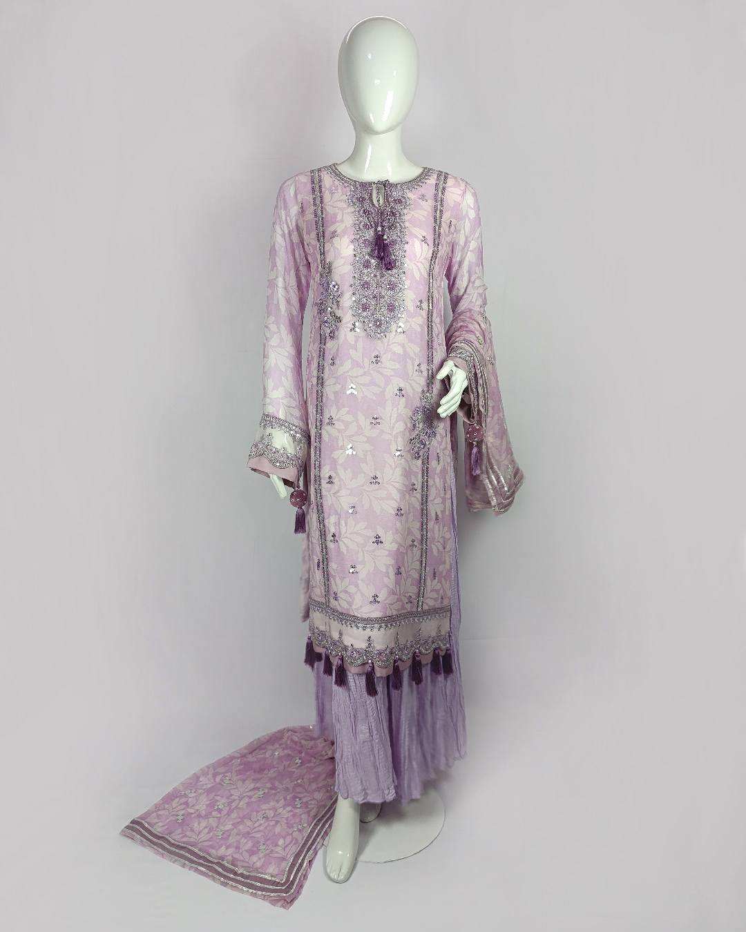 Step out in timeless elegance with our 3-piece luxury set featuring a beautifully embroidered chiffon printed shirt, paired with a chic malai gharara, and a graceful printed chiffon dupatta — a perfect choice for festive occasions.