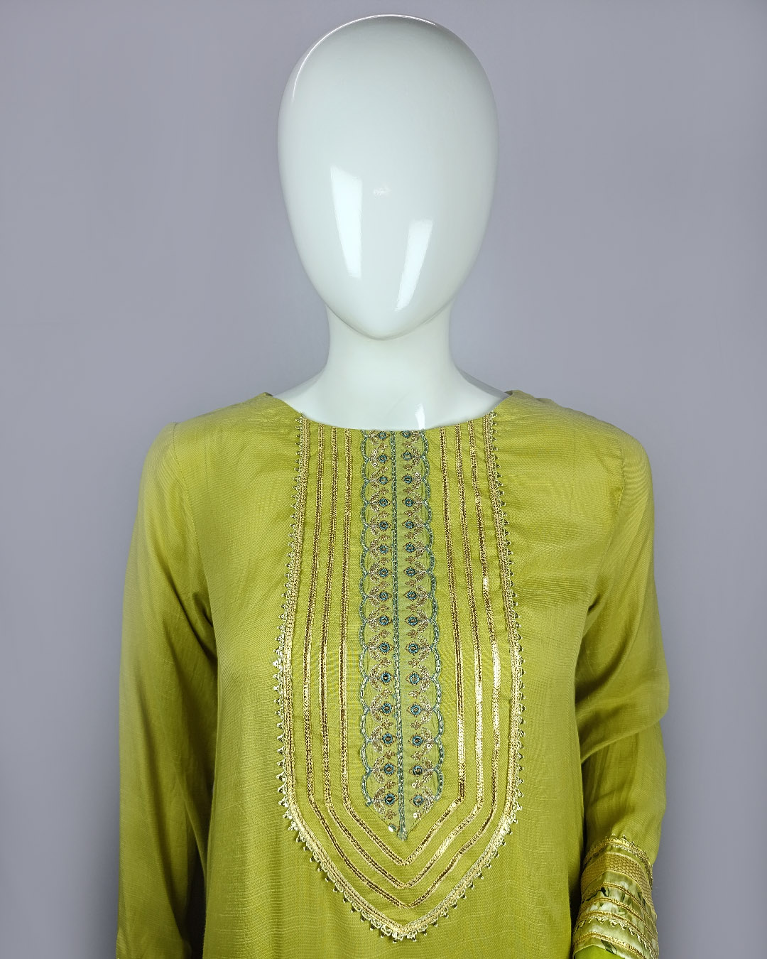 Step into luxury with this 3-piece statement outfit designed in a refreshing Green Apple shade. The embroidered malai shirt brings modern sophistication, complemented by a beautifully printed & embroidered gharara, and finished with a finely embroidered organza dupatta — a perfect fusion of style and elegance.