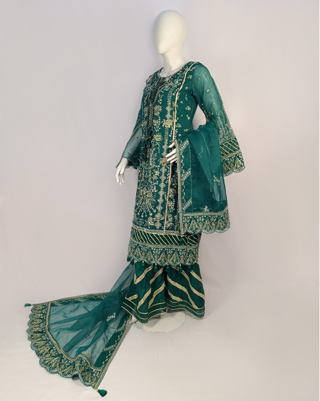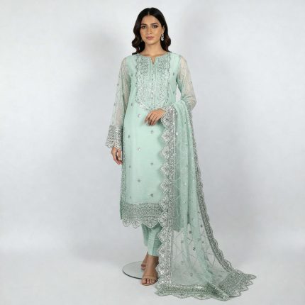 Turn heads this festive season with our luxurious 3-piece green ensemble, crafted to exude tradition and elegance. Featuring a delicately embroidered organza shirt lined with soft malai, paired with a flowing malai gharara, and completed with a richly embroidered organza dupatta — this outfit brings timeless charm to modern occasions.