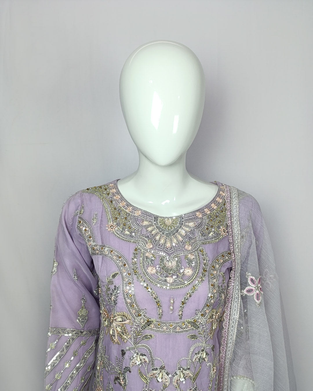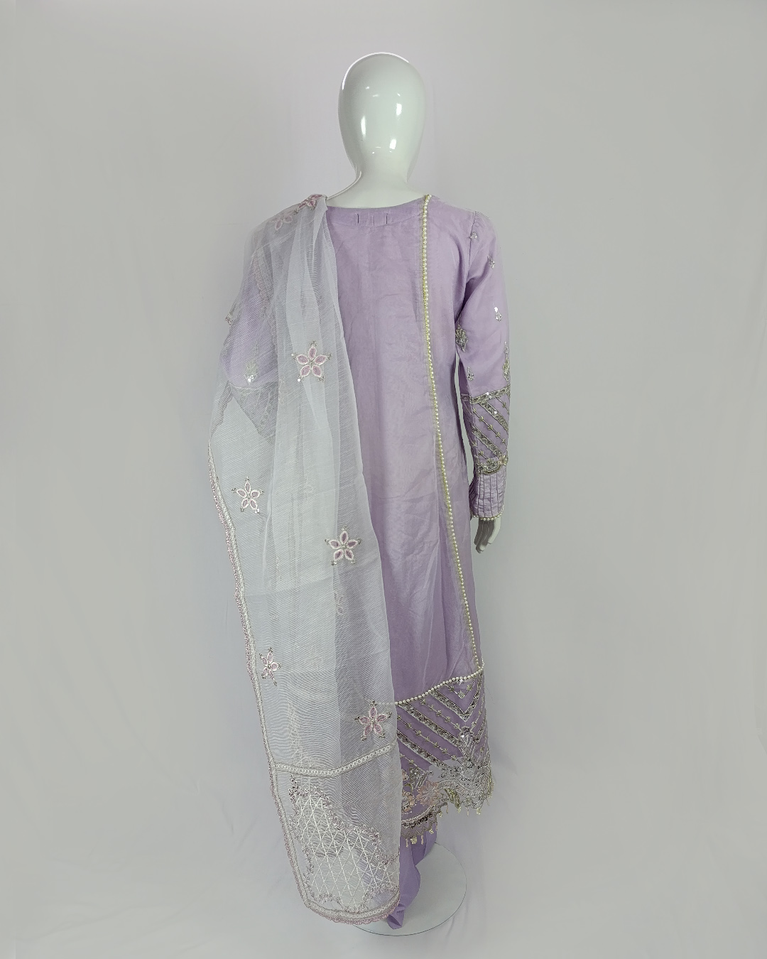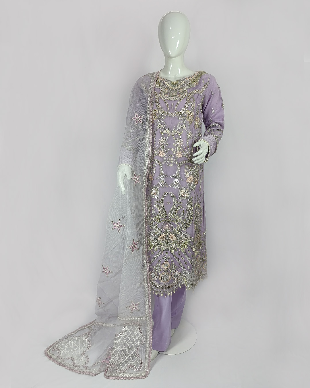 Elevate your wardrobe with this 3-piece luxury ensemble in a graceful mauve shade. Designed with an embroidered organza shirt layered over a soft malai inner, paired with a sleek malai trouser, and finished with a delicately embroidered machine net dupatta — this outfit brings sophistication to every occasion.