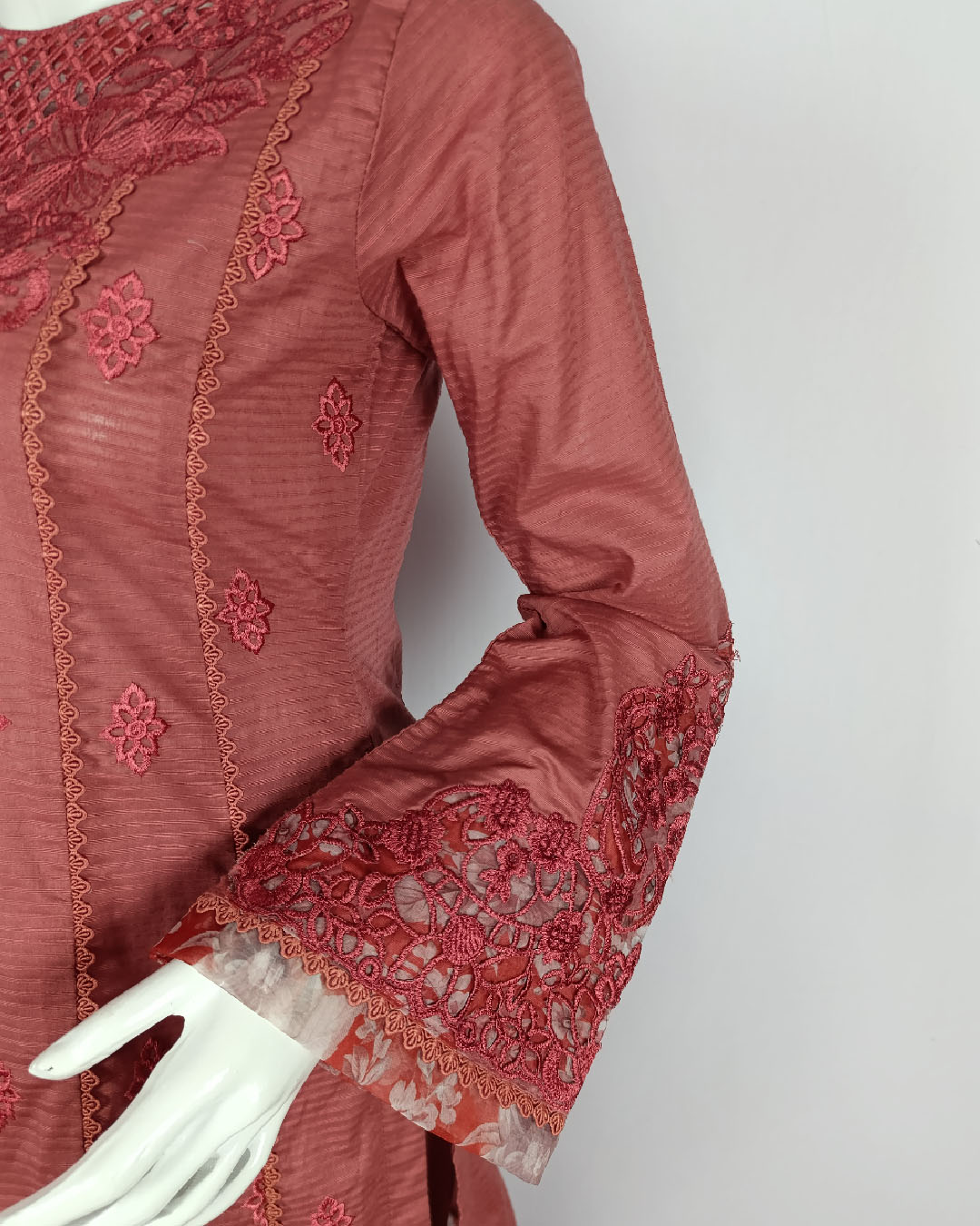 Step into refined elegance with our 3-piece signature red outfit. The embroidered doria lawn shirt with organza and lace accents is paired with a tailored cotton trouser, while the embroidered machine net dupatta completes the look with timeless charm. A graceful choice for festive evenings and special occasions.