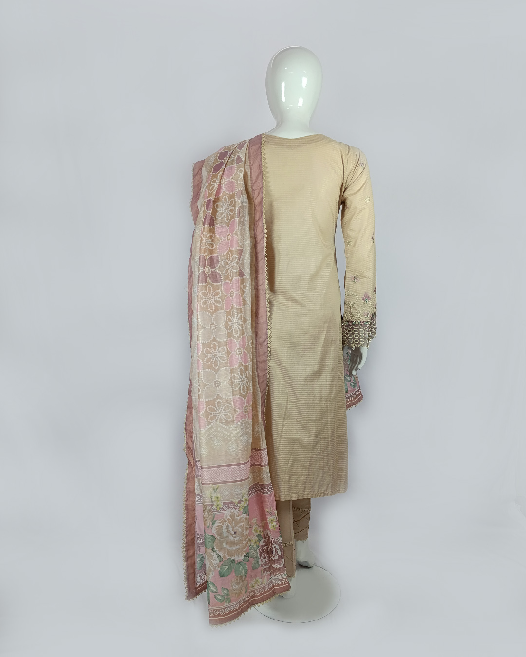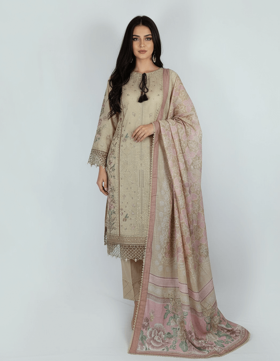 ✨ Redefine grace with this exquisite 3-piece signature outfit in a soft fawn shade. The finely embroidered doria lawn shirt is paired with a sleek cotton trouser, while the printed Munarkh dupatta adds a modern twist to traditional elegance. ✨