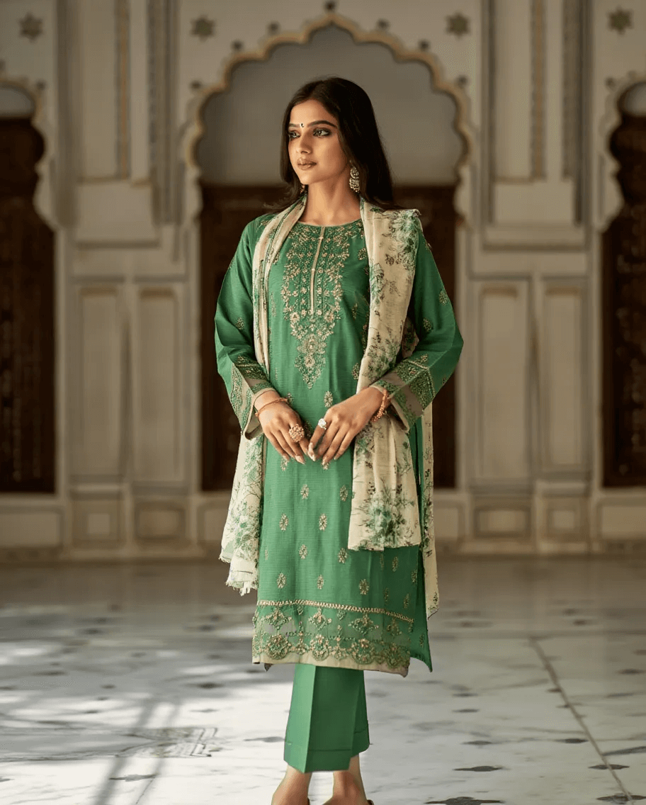 Elevate your wardrobe with this 3-piece embroidered set — a perfect blend of elegance and comfort. Featuring a Doria Lawn shirt, cotton trouser, and printed Munarch dupatta, this ensemble is ideal for semi-formal gatherings or stylish everyday wear.