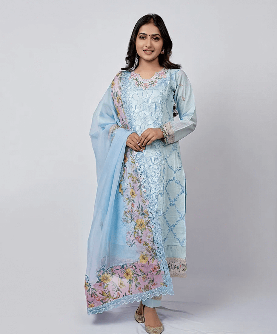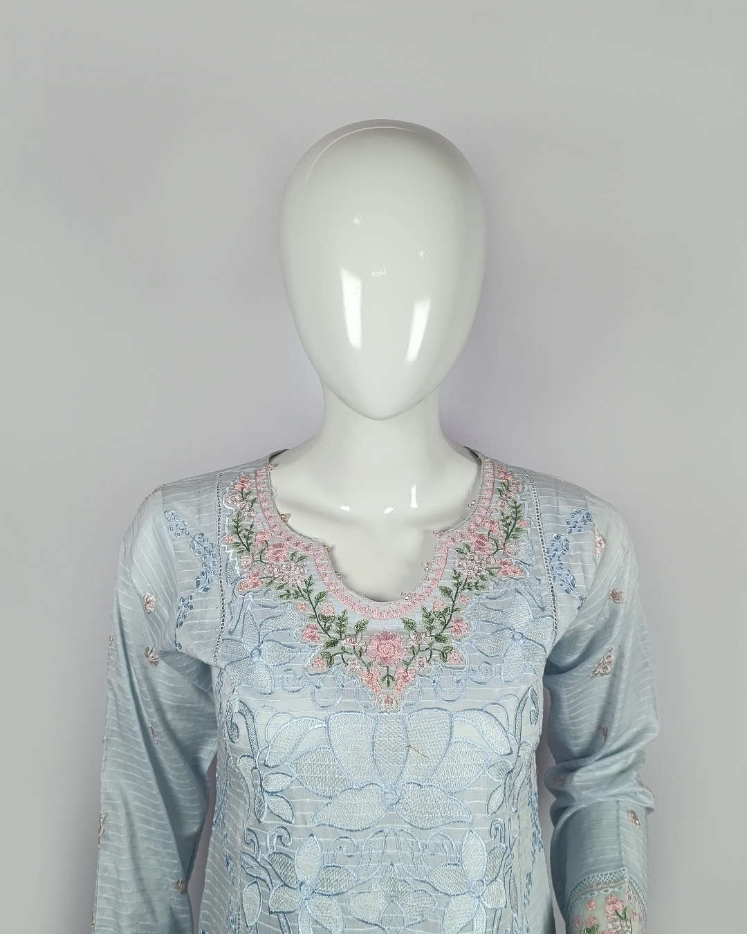 ✨ A refreshing sky blue ensemble that blends soft hues with intricate embroidery — perfect for effortless elegance this season. ✨
