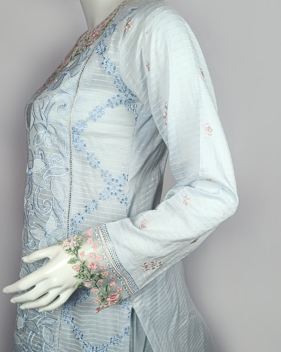 ✨ Refresh your wardrobe with this stunning 3-piece signature outfit in a serene sky blue shade. The embroidered doria lawn shirt is paired with a tailored cotton trouser, while the printed embroidered machine net dupatta adds a breezy touch of charm and sophistication. ✨