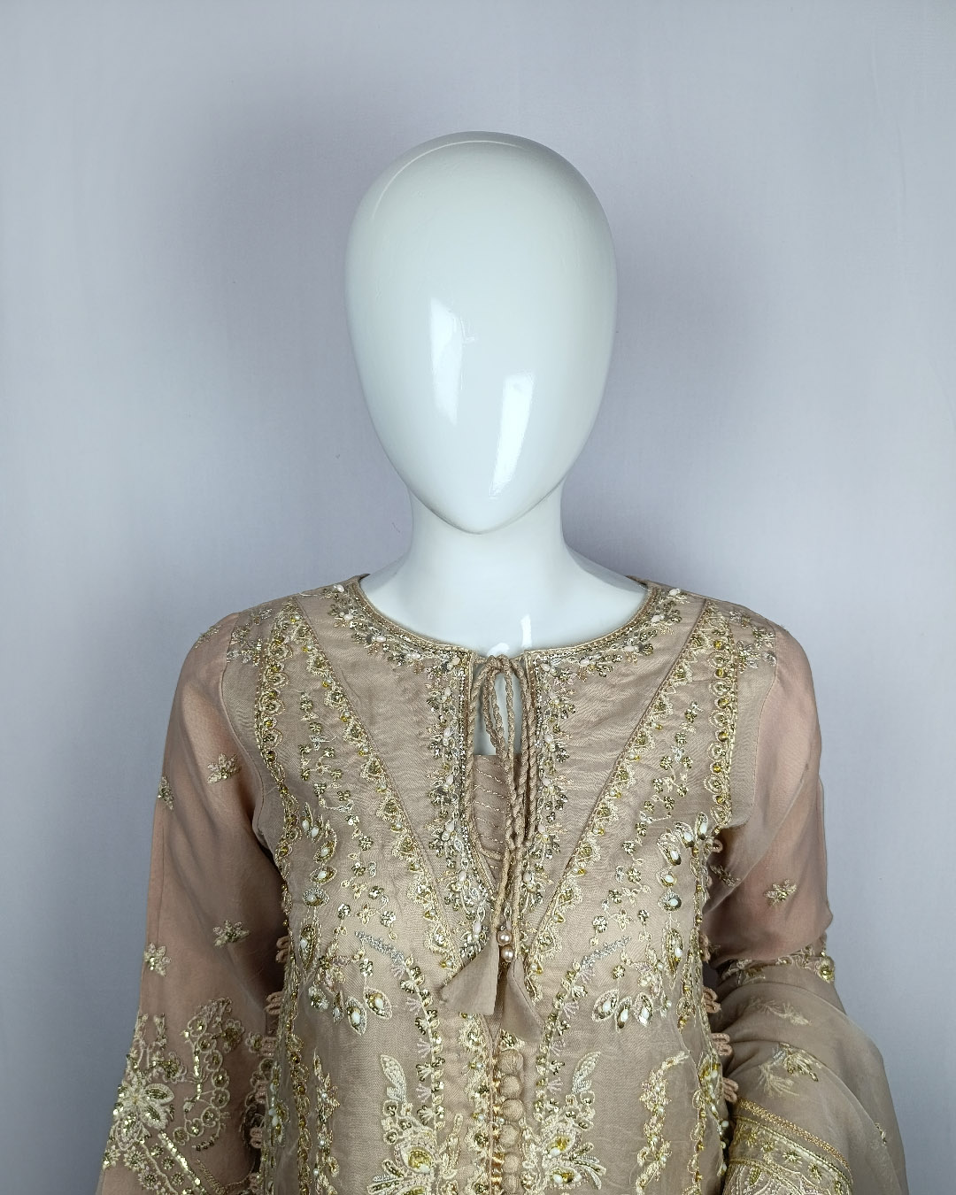 Radiate regal charm with a luxurious 3-piece golden fawn ensemble crafted for the most memorable occasions. The hand-embroidered organza shirt, lined with soft malai, offers unmatched elegance, while the flowing crush gharara brings graceful movement to every step. Completed with an embroidered organza dupatta, this outfit embodies luxury and artistry, making it an exquisite statement for engagement ceremonies, cultural festivities, or high-profile soirées.