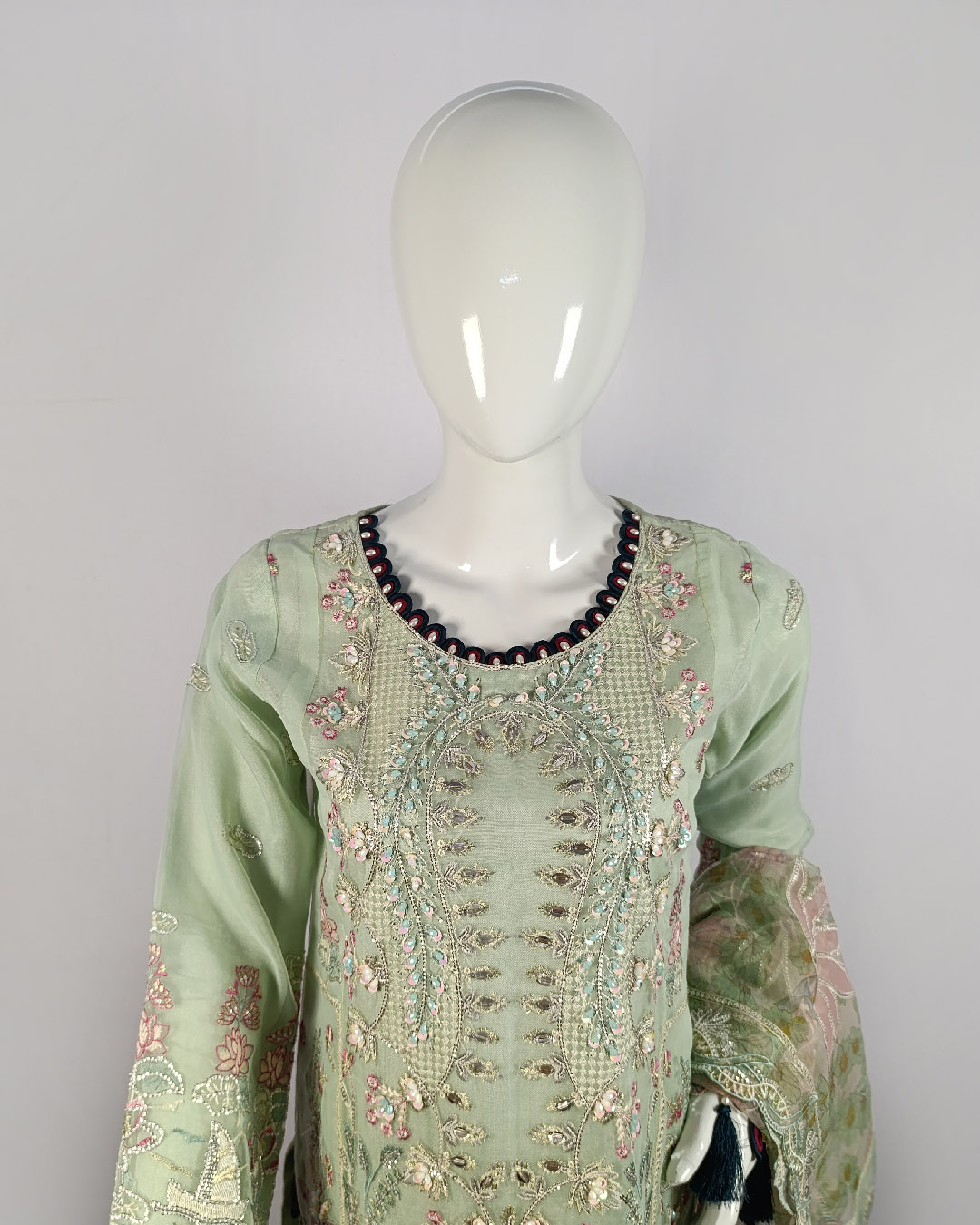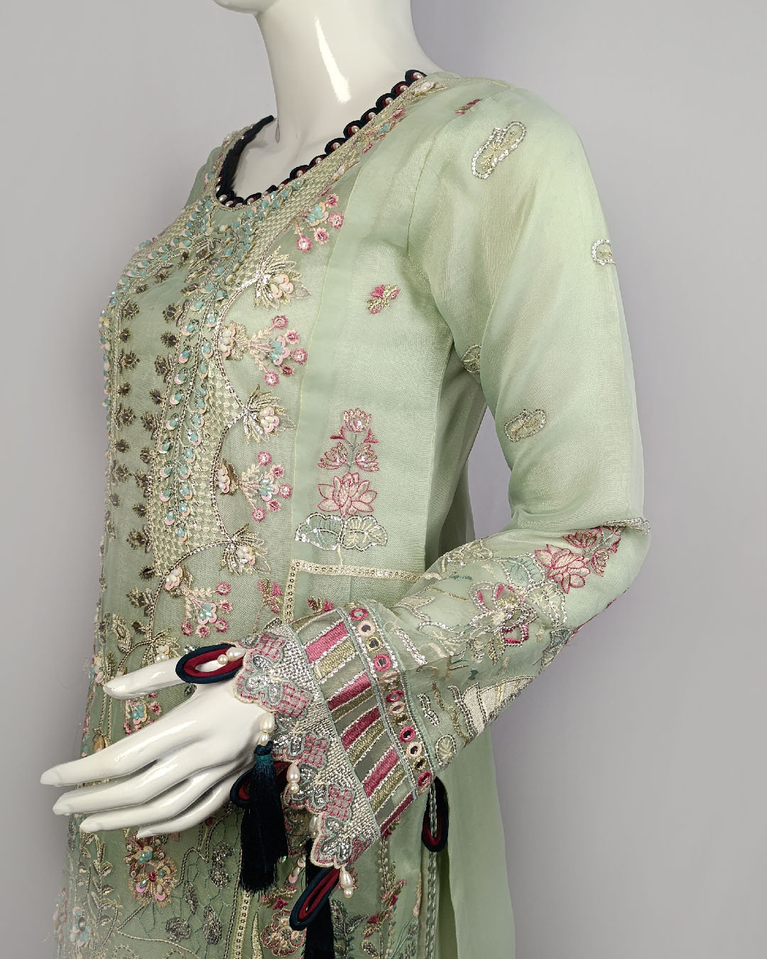 Step into elegance with this exquisite 3-piece set featuring a hand-embroidered organza shirt, comfortable gharara malai bottom, and an embroidered & printed organza dupatta — perfect for festive and special occasions.