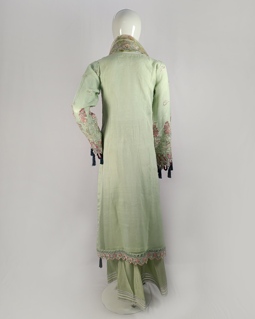 3 PIECES – Hand embroidered shirt with gharara bottom along with embroidered & printed organza dupatta
