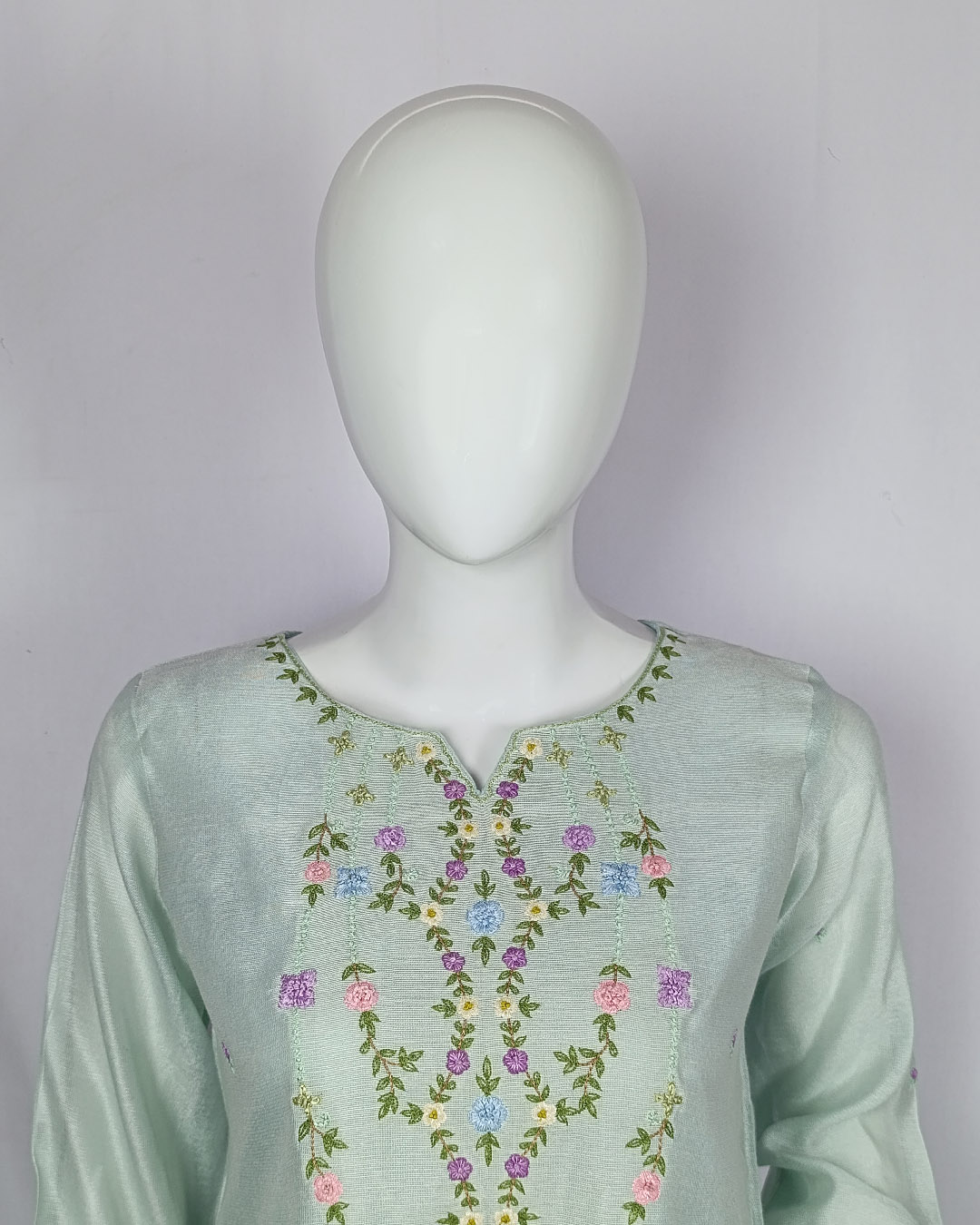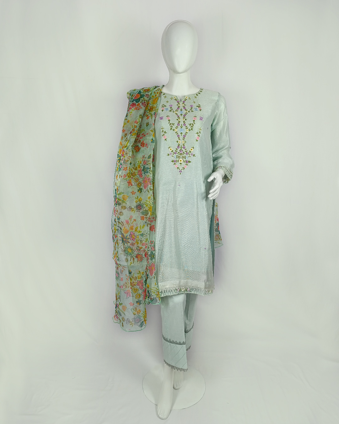 Elevate your festive wardrobe with this 3-piece hand-embroidered set. The cotton net shirt features delicate hand embroidery and organza accents, paired with a soft cotton trouser and a flowy organza printed dupatta — a perfect combination of elegance and comfort.