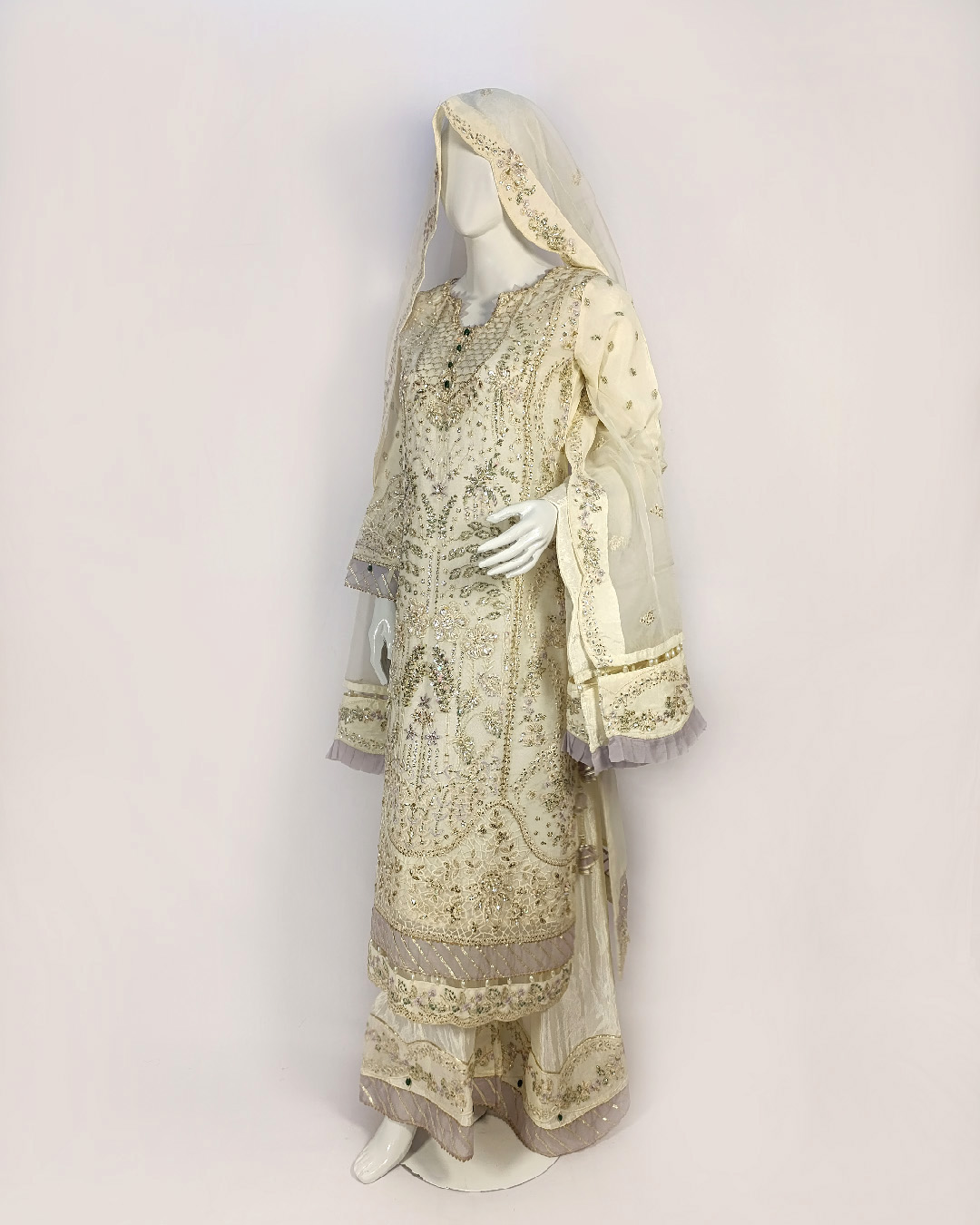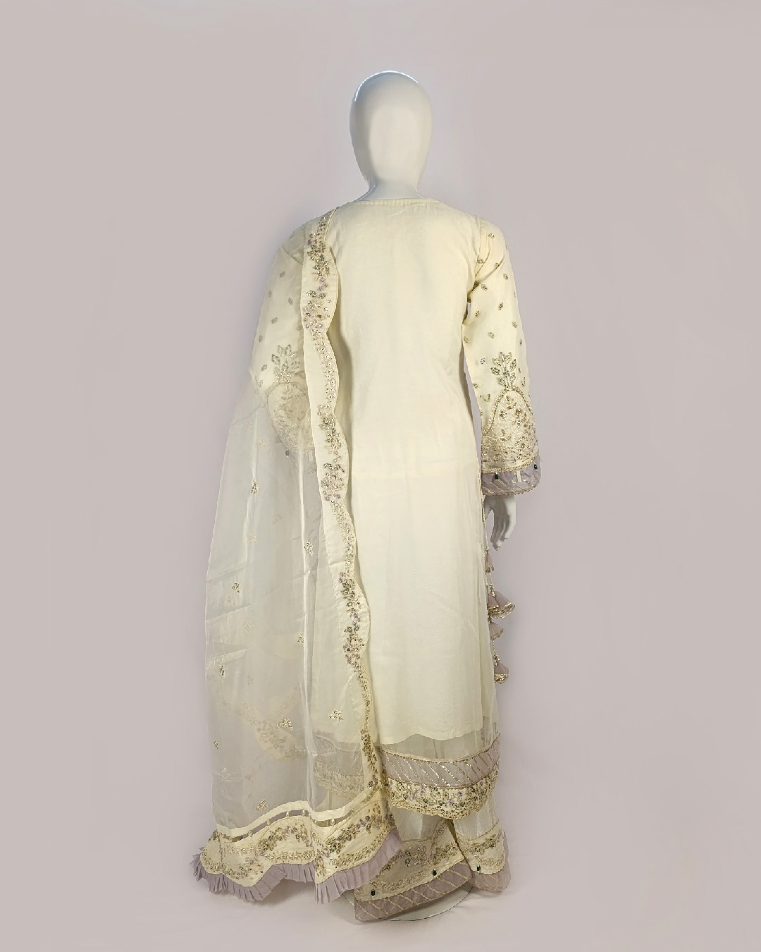 An elegant and refined 3-piece outfit in a beautiful cream tone, perfect for formal wear or festive occasions. This design features a finely embroidered organza shirt with a soft malai lining, paired with a trendy flapper-style malai bottom, and completed with a flowy organza dupatta. Every stitch speaks of luxury, detail, and timeless sophistication.
