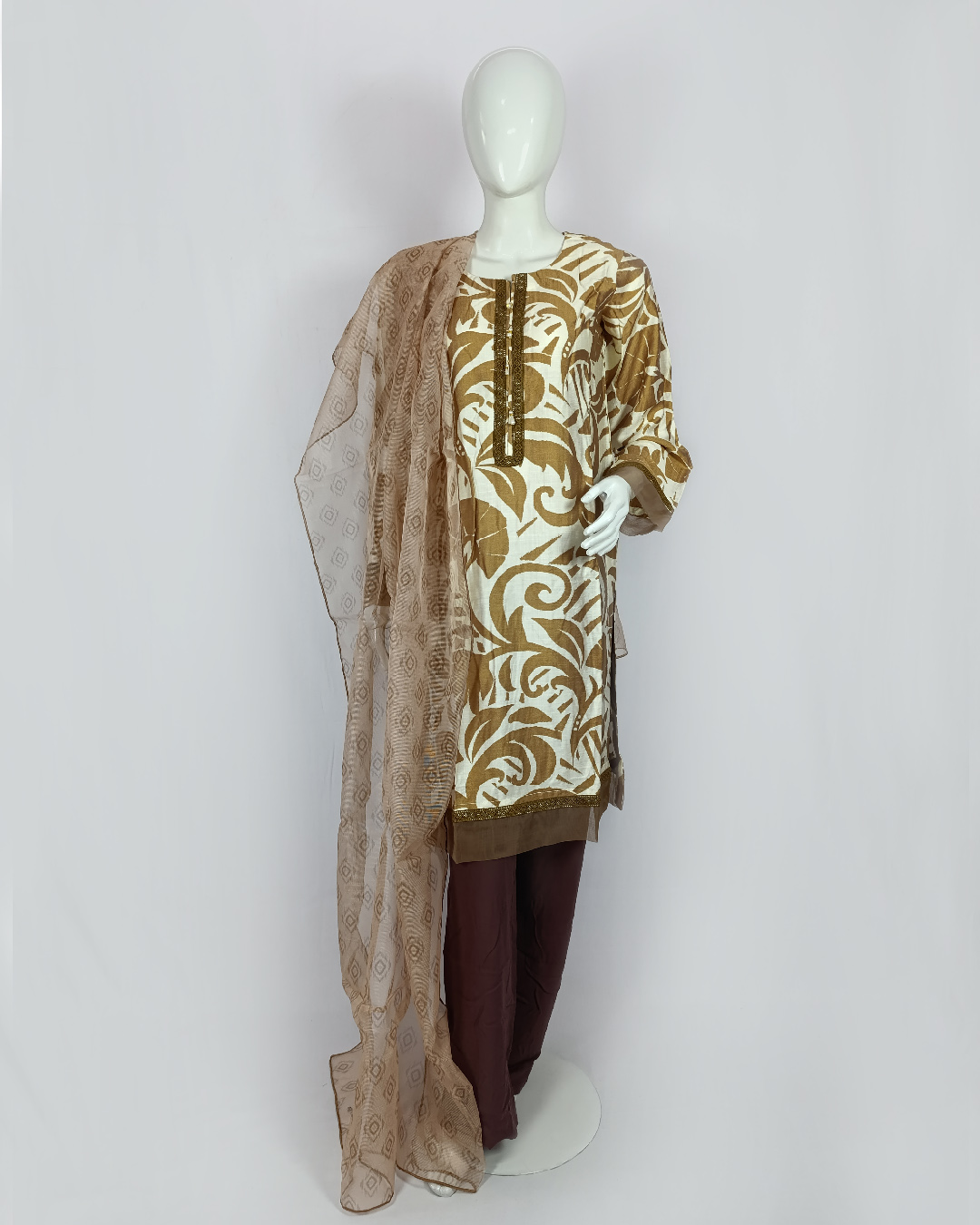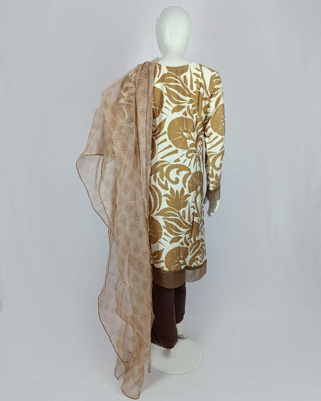 Elegance meets comfort in this charming 3-piece set designed for effortless style. The printed Khaddar shirt, enhanced with lace and subtle pearl accents, pairs beautifully with a classic cotton trouser. A printed machine net dupatta completes the ensemble, making it perfect for casual outings or semi-formal gatherings.