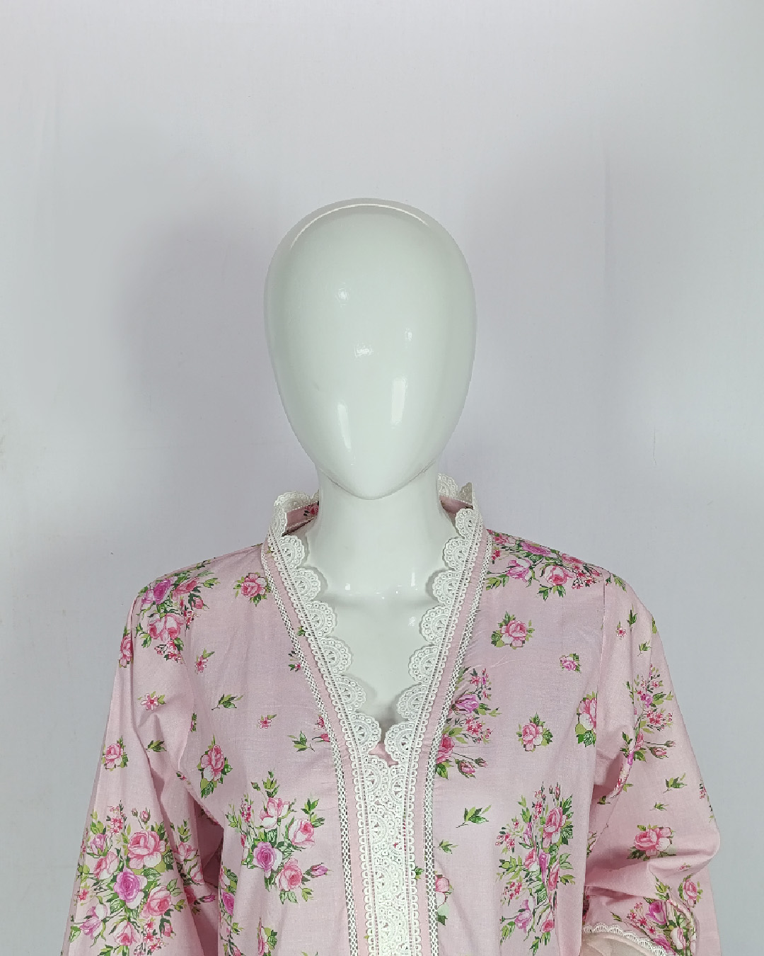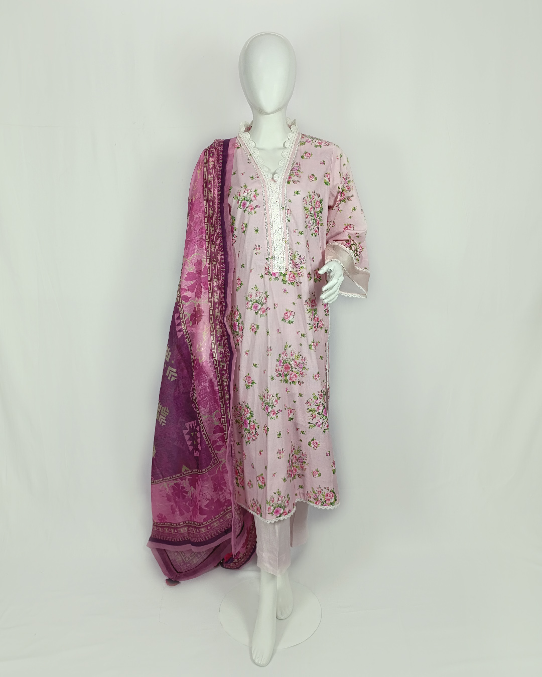 Infuse your wardrobe with soft feminine grace through this 3-piece essential ensemble. The printed lawn shirt enriched with lace and organza detailing pairs effortlessly with a cotton trouser, while a printed monarch dupatta completes the look. Subtle pearl and tassel accents add a charming touch — perfect for refined everyday wear in soothing pink tones.
